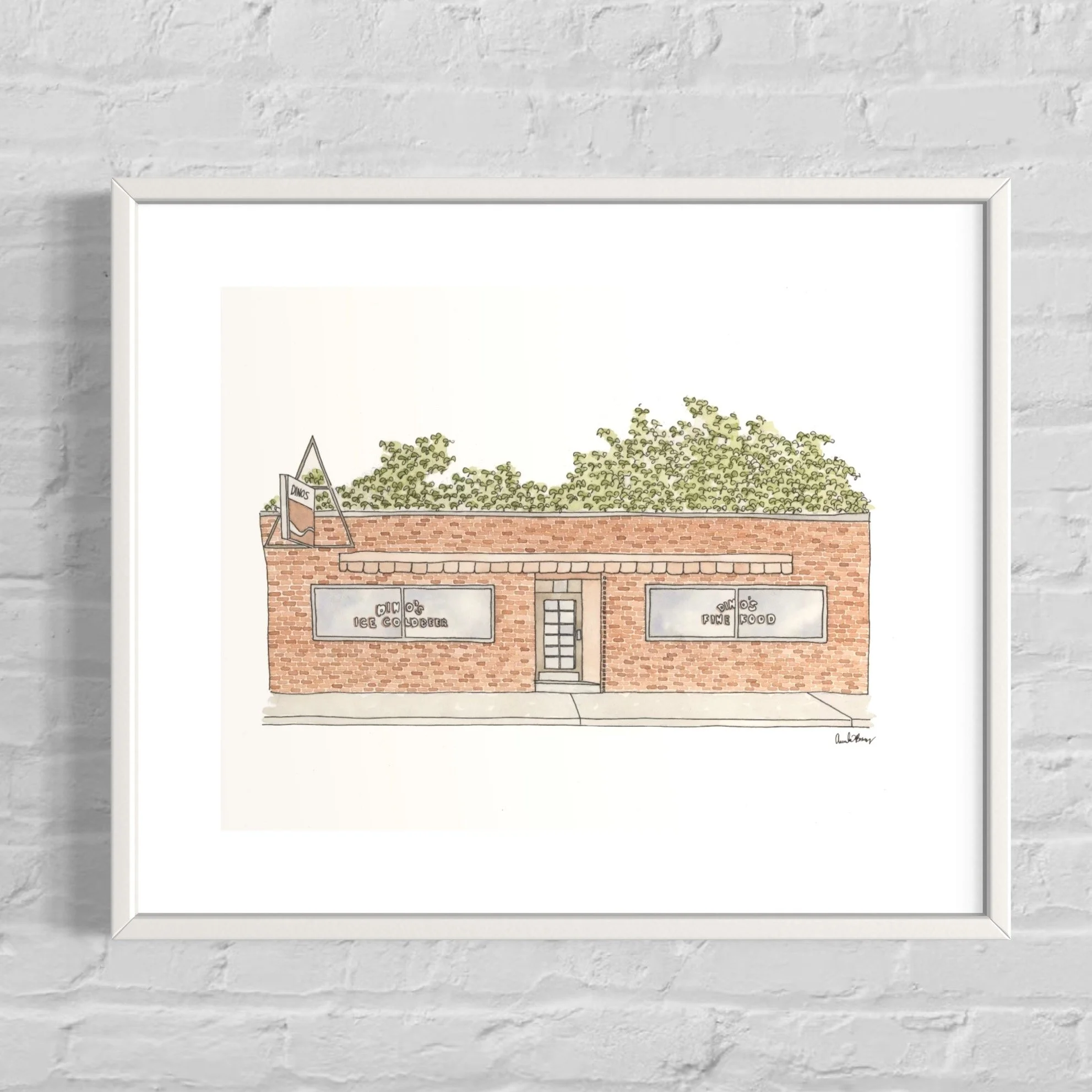 Average Production Time is 1-3 business days before shipping–and average production time for prints with frames is 5 business days. Rights to Reproduce does not transfer with sale of artwork. All work is copyright protected– © Amelia Bradshaw. Not affiliated with restaurant or establishment. Colors may differ slightly from monitor to print.
